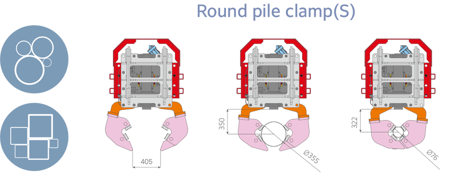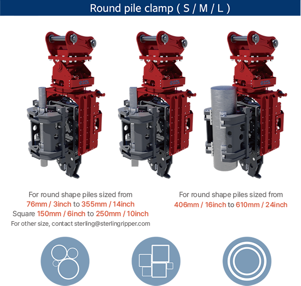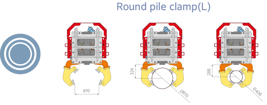 Thanks to its interchangeable side clamp system, the Sterling Side Grip pile driver can handle all types of piles with its multiple clamps, and it offers quick transfer capability between various applications. Round pile clamp(S) and round pile clamp(L) are an option.