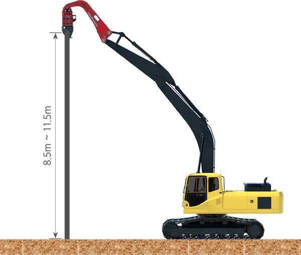 | Weak point | Low vibratory power Difficult to interlock sheet piles due to free tilt structure Sheet pile is likely to be bent due to free tilt structure Expensive | Non tilt structure – Need an assistant of operator |