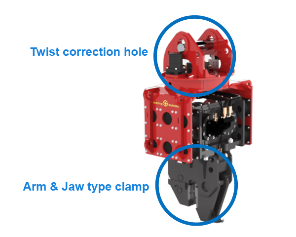 | Feature | Twist correction hole in the middle of the body Free tilt clamp Arm & Jaw type, indirect clamp cylinder structure Free revolving mounting adapter | Twist correction hole on the mounting adapter Non tilt clamp. Arm & Jaw type clamp. Hydraulic revolving mounting adapter |