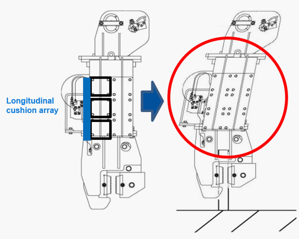 | Transverse cushion array minimize a chance of bending of hammer and piles./2 | Longitudinal cushion array causes bending of hammer and pile which leads to damage to cushions and piles. |