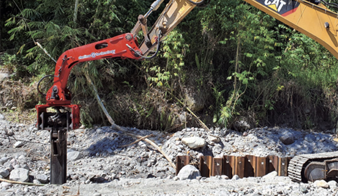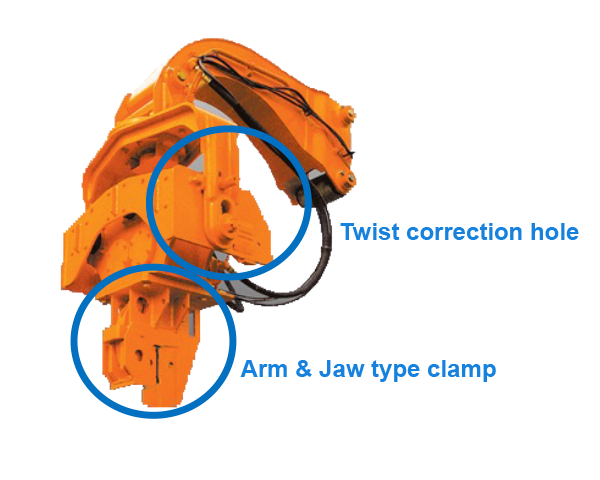 | Weak point | Low vibratory power Difficult to interlock sheet piles due to free tilt structure Sheet pile is likely to be bent due to free tilt structure Expensive | Non tilt structure – Need an assistant of operator |